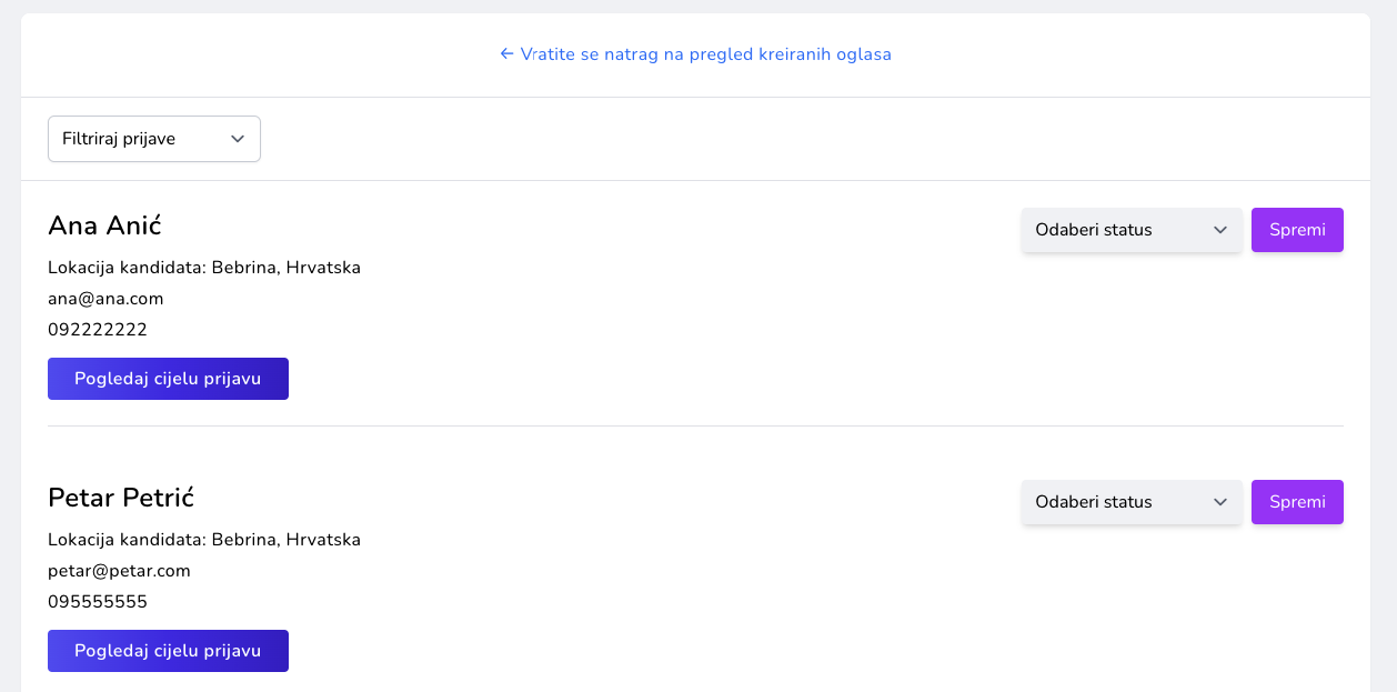 Radnici se mogu prijaviti na vaš oglas pomoću portala. Vi možete vidjeti njihove prijave i životopise.